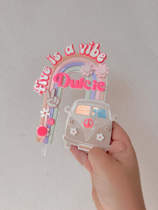 Single name cake topper | hippy floral Van vibe 5th | Mirror + Colour Base | Name Tag, Event Decor
