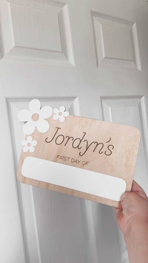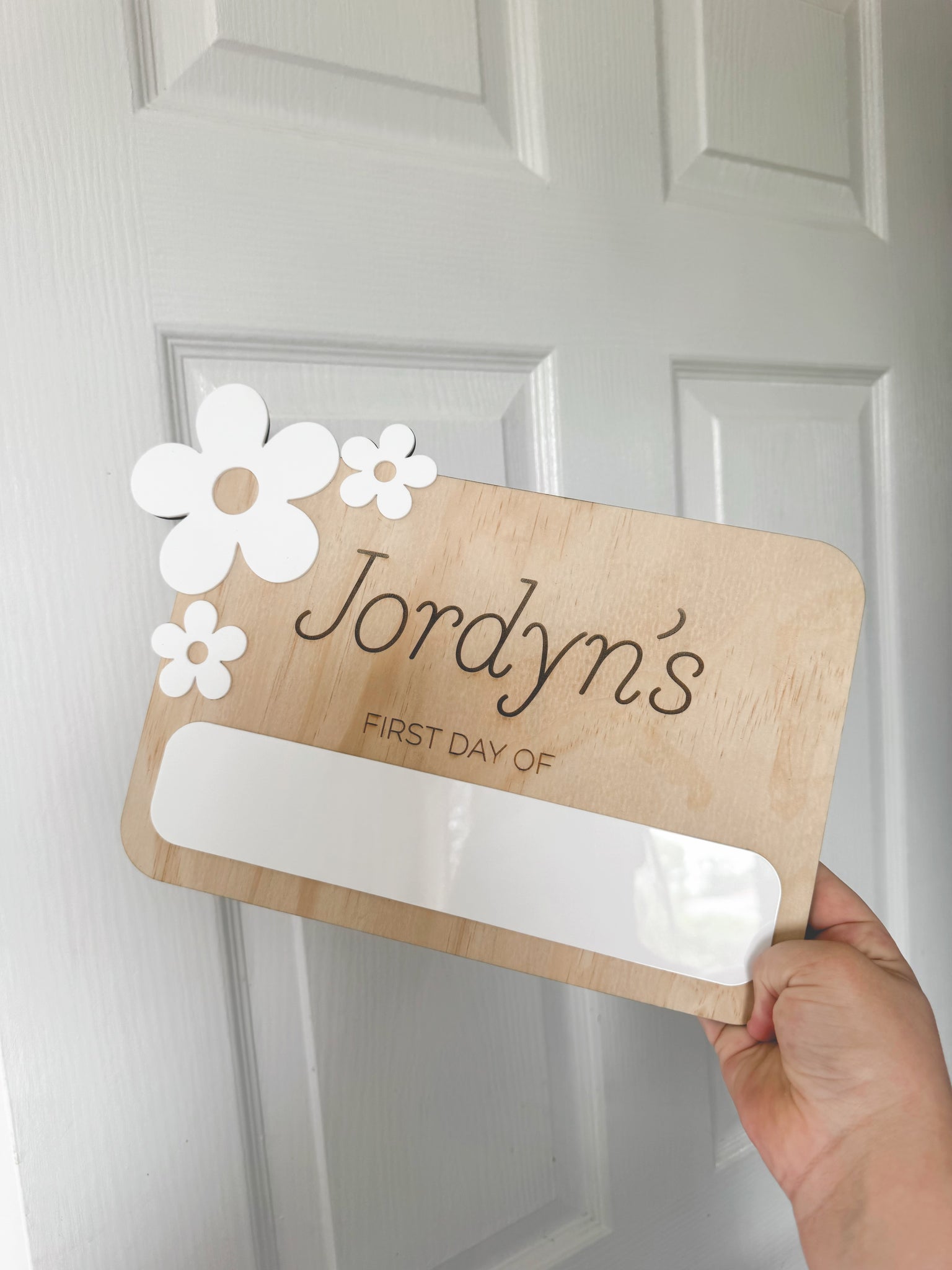 This board features a sweet engraved daisy design with your child’s name and the phrase “[Name]’s First Day of” permanently engraved at the top. Below, a smooth whiteboard section allows you to write in the grade, teacher, school year, age, or any special notes — then wipe clean and reuse again and again.