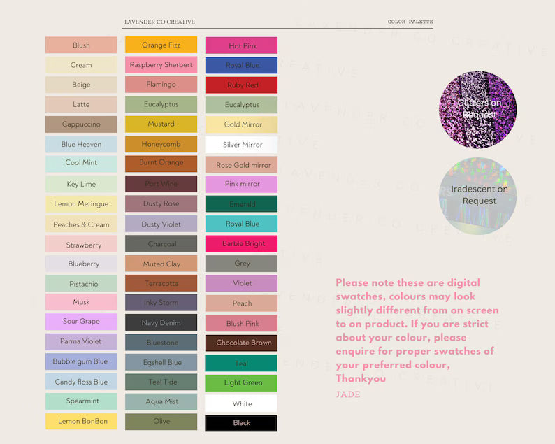 • Colours shown: pastel yellow background, pink & white lettering (custom colour options available)