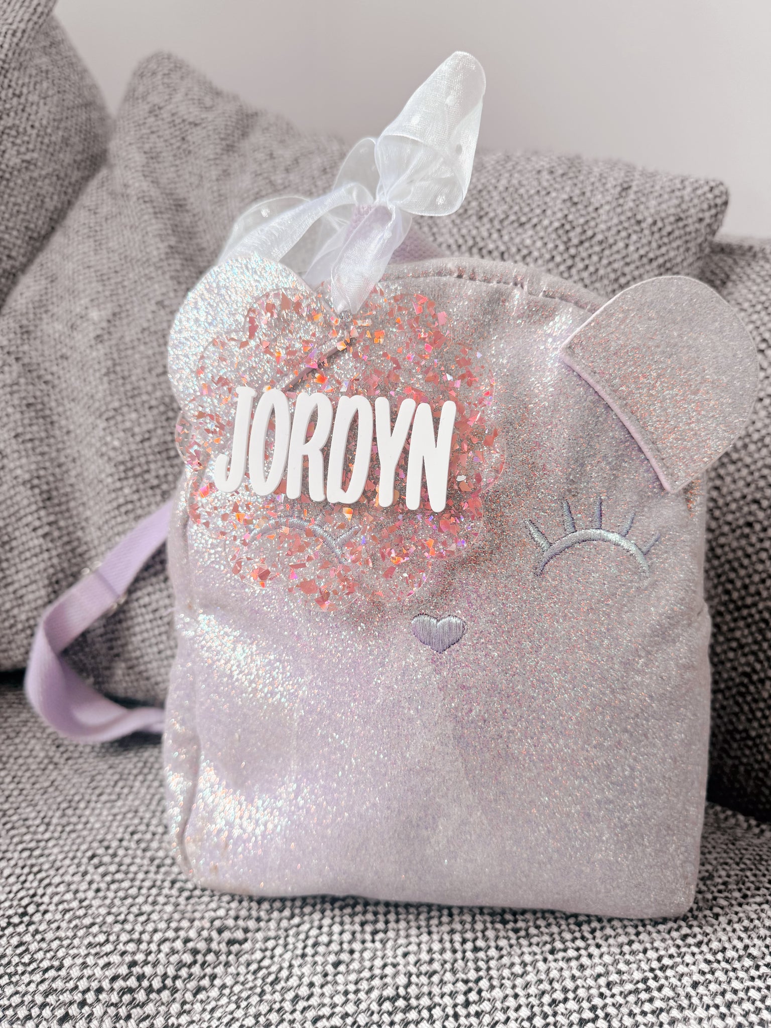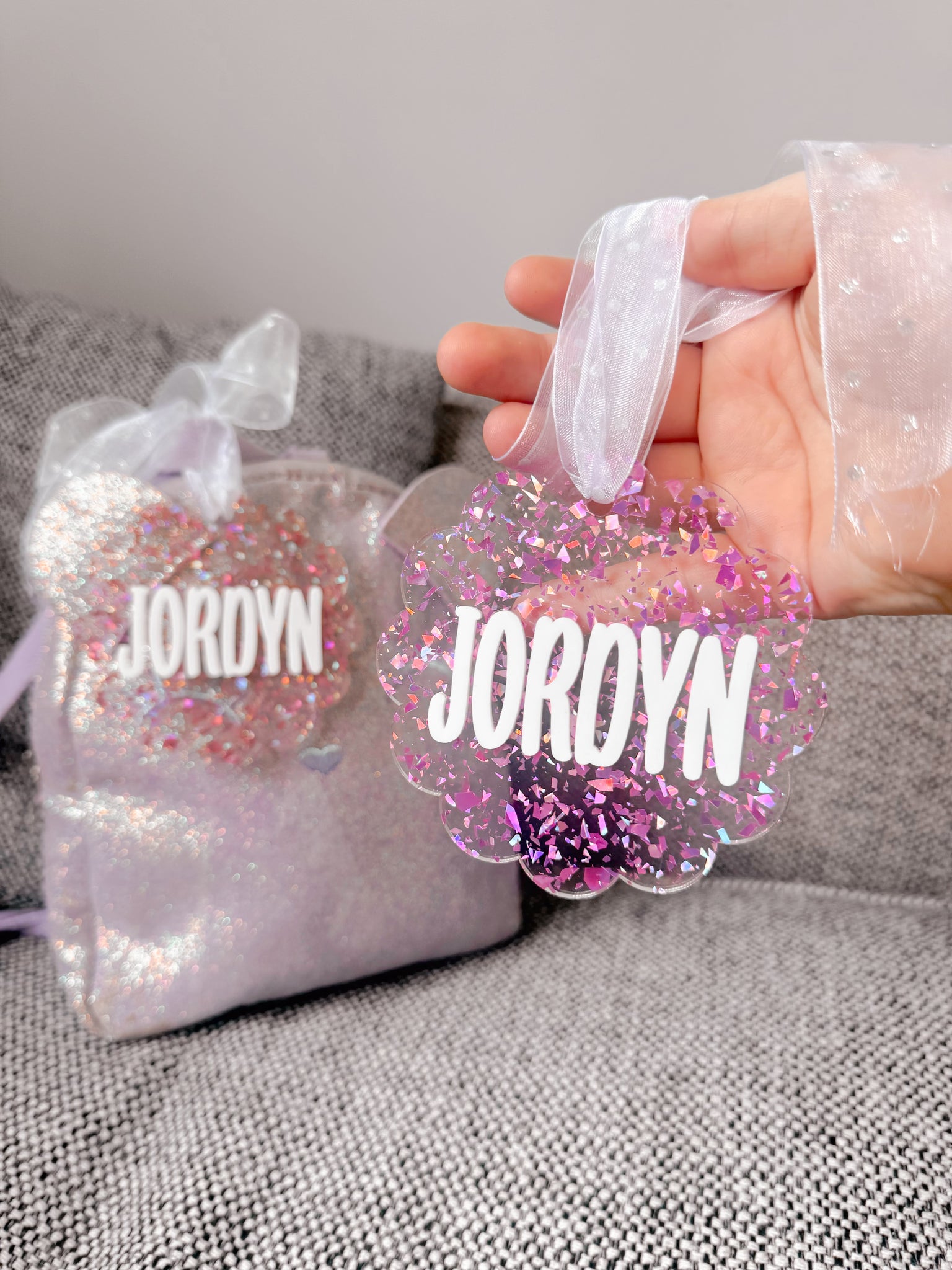 Keep track of your little one's essentials with these stunning, personalized glitter acrylic bag tags! Not only are they incredibly durable and easy to spot, but the beautiful shimmering finish makes them a fun accessory for any bag. Say goodbye to lost property and hello to effortless style!